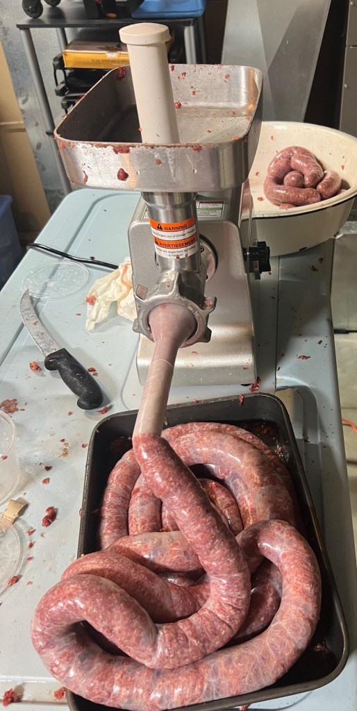 This year that last step in the deer hunting process took me almost eight hours from start to clean-up, including a second trip to John’s on Mill Street for more casings and additional helpful hints. The mix of spices and seasonings I use is a creation of my own, based on research and ideas stolen from other places.